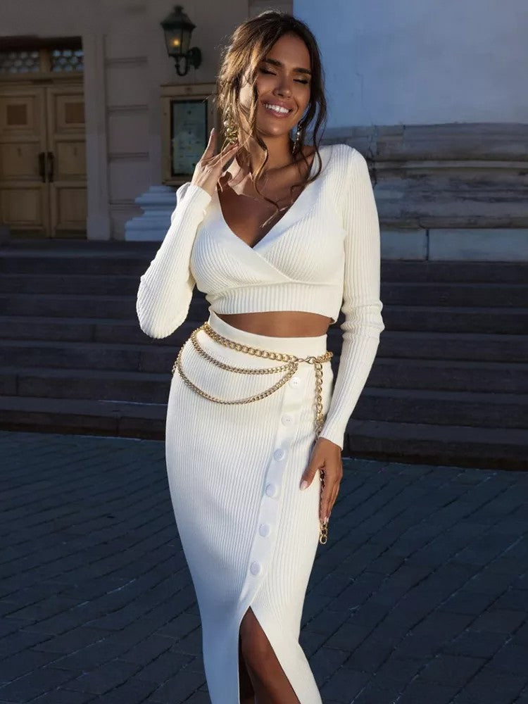 Deze lucky set bestaat uit een crop top met v-hals en lange mouwen, en een lange bijpassende rok met zijsplit.
