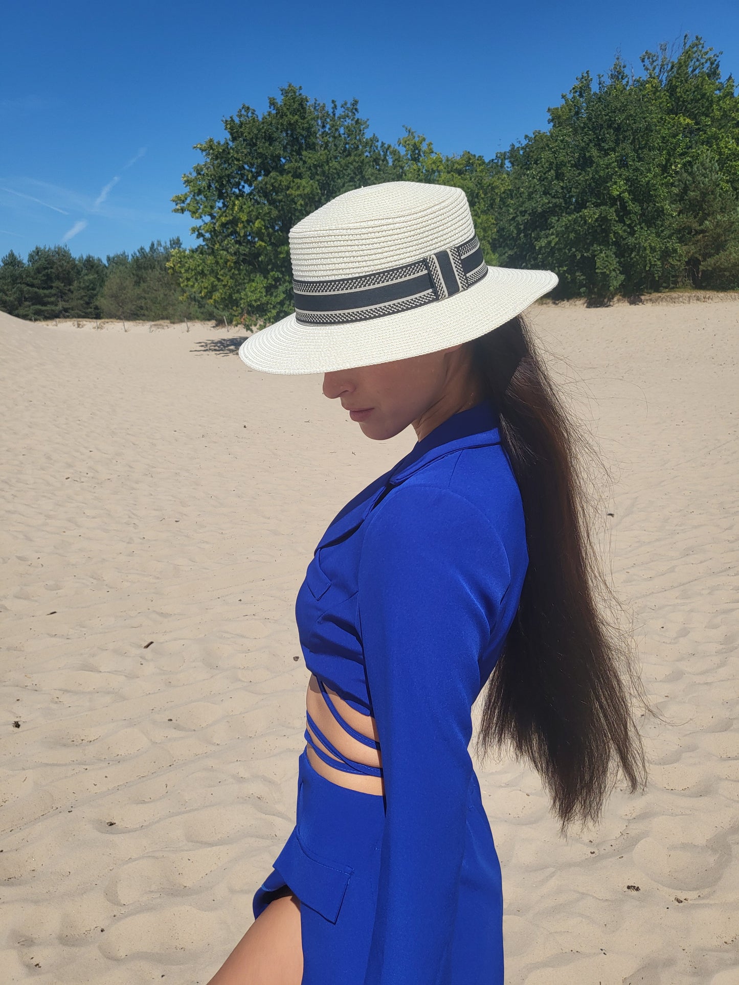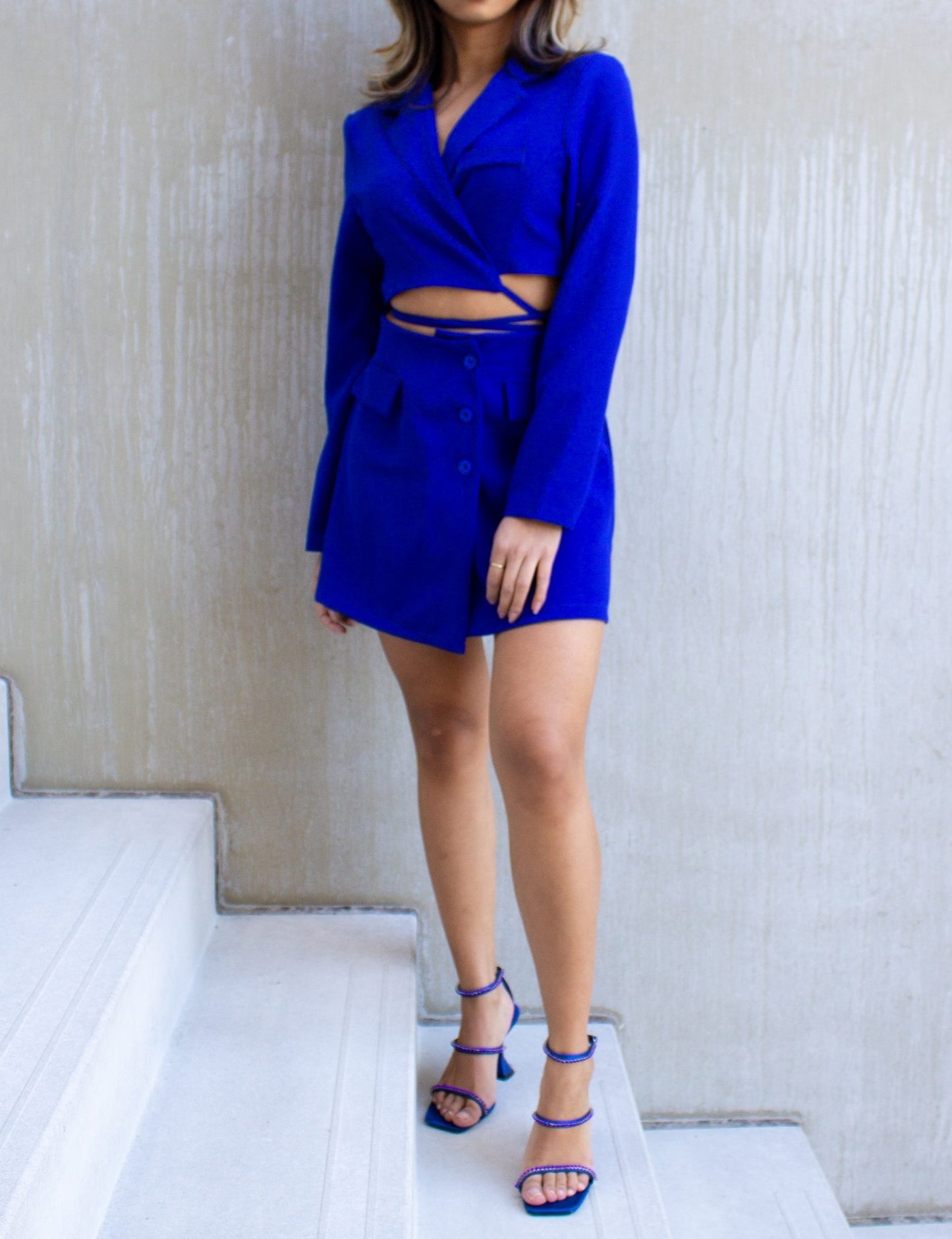 Leuke set in het kobalt blauw. Deze set bestaat uit een crop blazer met wikkel touwtjes die je om je taille heen kunt wikkelen en een bijpassend rokje.